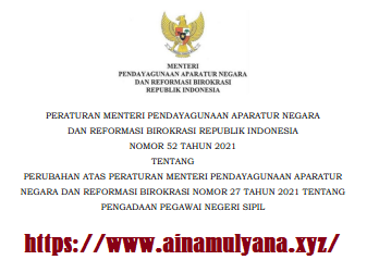 Berdasarkan pasal I Peraturan Menpan RB atau Permenpan RB Nomor 52 Tahun 2021 Tentang Perubahan Atas PermenpanRB Nomor 27 Tahun 2021 Tentang Pengadaan PNS (Pegawai Negeri Sipil), dinyatakan bahwa Beberapa ketentuan dalam Peraturan Menteri Pendayagunaan Aparatur Negara dan Reformasi Birokrasi Nomor 27 Tahun 2021 tentang Pengadaan Pegawai Negeri Sipil (Berita Negara Republik Indonesia Tahun 2021 Nomor 654), diubah sebagai berikut: