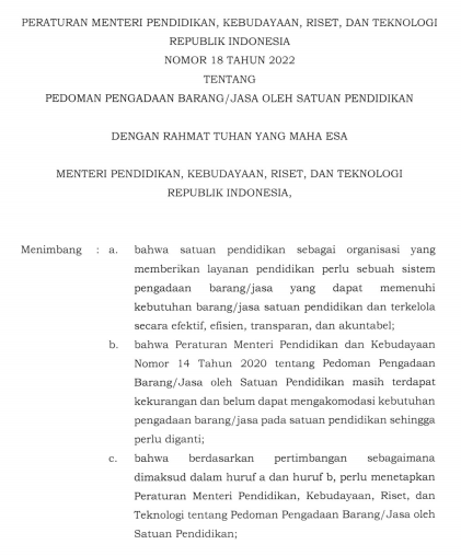 Permendikbudristek Nomor 18 Tahun 2022 Tentang Pedoman Pengadaan Barang Jasa Oleh Satuan Pendidikan